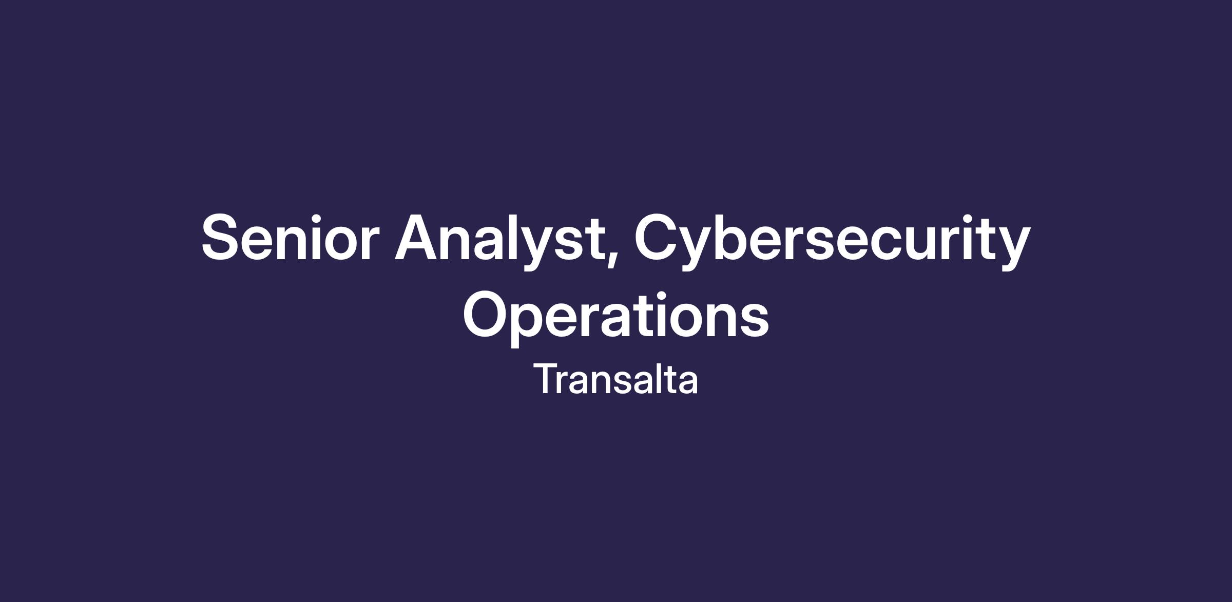 TransAlta is now hiring a Senior Analyst, Cybersecurity Operations to join our Cybersecurity team on a full-time basis, reporting to our Director, Cyber Security.